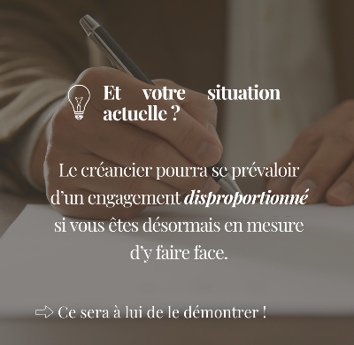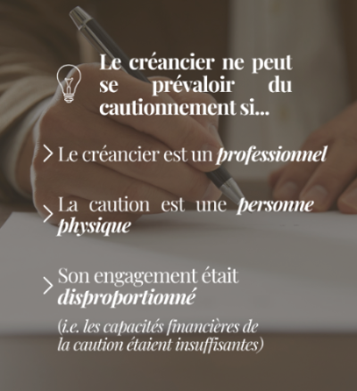 💡Si, au moment de la signature, l’engagement de caution était manifestement disproportionné aux biens et revenus de la caution (personne physique), le créancier professionnel ne peut pas s'en prévaloir.